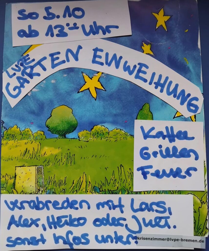 Seit vielen Monaten träumten einige Aktivist:innen der Psychiatrieselbsthilfe und ihre Familien und Freund:innen von einem Selbsthilfegarten. Ende September wurden endlich zwei super geeignete benachbarte Kleingärten gefunden, und Anfang Oktober wurde der Garten dank der finanziellen Unterstützung aus Globalmitteln des Beirats Gröpelingen und des verständnisvollen Kleingartenvereins eingeweiht. Dank der tollen Umgebung und mit der freundschaftlichen Nachbarschaft ist der Selbsthilfegarten im “Kleingartenpark In den Wischen” jetzt ein Ort, in dem Menschen aus dem seelisch belastenden Alltag aussteigen und mit Gartenarbeit zu sich selbst finden können. Danke an alle, die dieses schöne Projekt möglich gemacht haben.