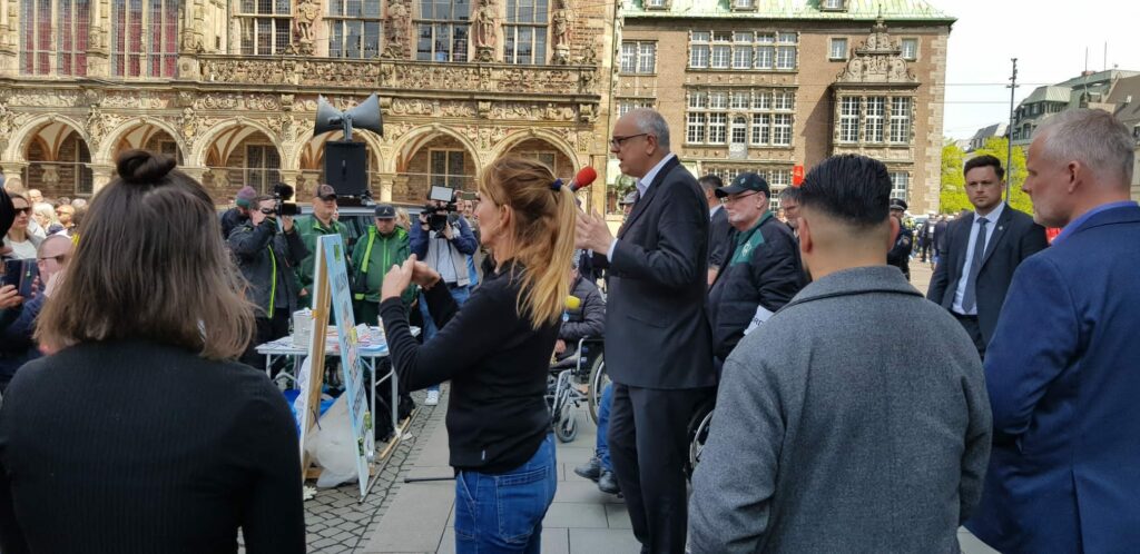 Am Aktionstag gegen Diskriminierung und für Gleichstellung der Menschen mit Behinderungen zogen wir durch die Bremer Innenstadt und überreichten bei einer Kundgebung unsere Forderungen für mehr selbstbestimmte Teilhabe an Bremens Bürgermeister Dr. Andreas Bovenschulte. Auf dem Weg zum Marktplatz übergaben wir an Gesundheitsstaatsrätin Silke Stroth einen “Brandbrief” für die Wiedereröffnung des Medizinischen Zentrums für Erwachsene mit geistiger und schwerer mehrfacher Behinderung (MZEB). Diese Aktion haben wir in einem Film dokumentiert, der hier zu sehen ist. Außerdem gibt es weiteres umfangreiches Fotomaterial der “Raumfotografie” von Frank Scheffka, das hier zu sehen ist. Im Aktionszeitraum von Aktion Mensch kamen rund 300 Forderungen auf unseren Postkarten zusammen. Mit dem Film und unserem Kampagnen-Bild setzten wir die Aktion auf der Reha-Messe IRMA 2023 am 1.-3. Juni fort und warebn für das Mitmachen in unserem Aktionsbündnis Bremer Protest. Hier noch einige Fotos: